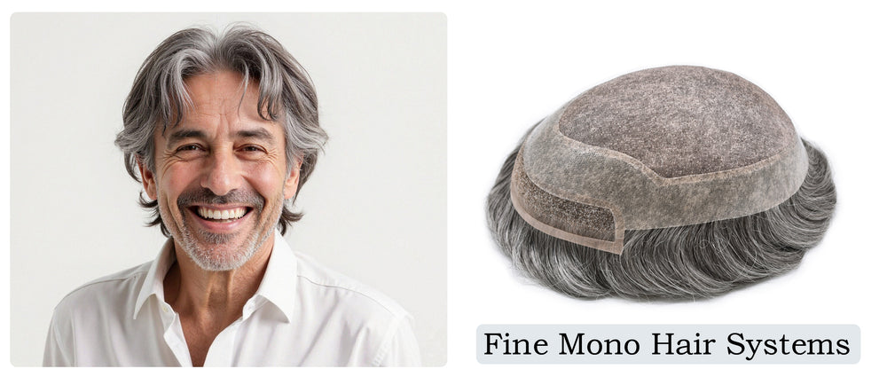 Fine mono hair systems are built with a lightweight monofilament base, offering a balance of natural appearance, airflow, and durability for reliable everyday wear.